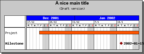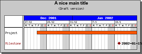 Milestones are similar to bars but have no end date since milestones just apply to one single date. Milestones are created much the same way as activities but using method MileStone() instead.