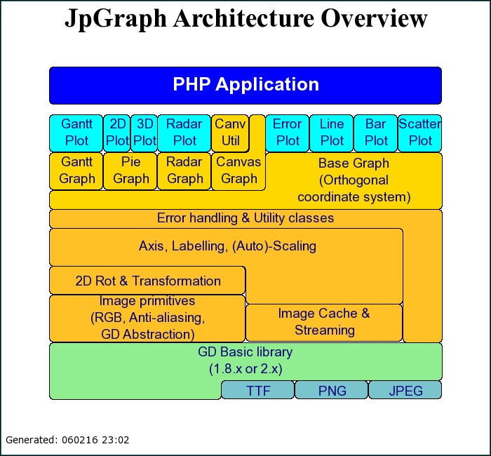 Canvas graphing is an advanced feature that comes in handy where you need to draw some more arbitrary graphics. To give you a flavor of what you can do the following example shows an architecture overview of JpGraph which was drawn using a canvas.