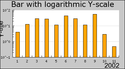 Even though we have so far only shown line graphs logarithmic scale can also be used for bar, error, scatter plots as well. Even radar plots supports the use of logarithmic plots. The following example shows how to use a logarithmic scale for a bar graph.